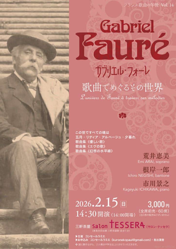 2/15(日)14:30開演 三軒茶屋 Salon TESSERA(サロン・テッセラ)出演者:荒井恵美、根岸一郎(バリトン)、市川景之(ピアノ)私は、歌曲集「Chanson d’Eve」エヴの歌 を全10曲。五月、リディア、アルページュ、夕暮れそして、2重唱“この世ですべての魂は... -